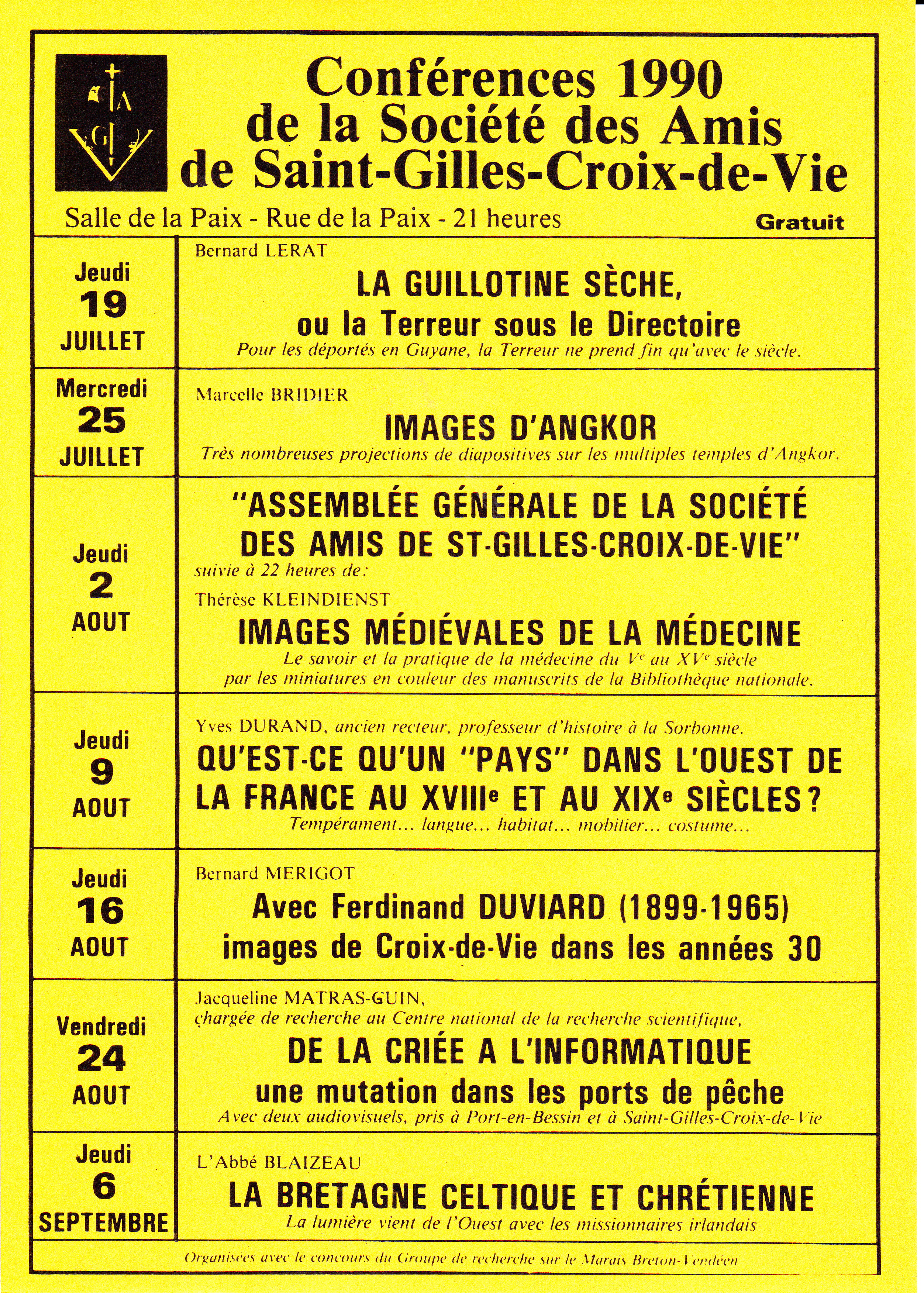 Annonce de la conférence d’Yves DURAND, ancien recteur, professeur d’histoire à la Sorbonne organisée par la Société des Amis de Saint-Gilles-Croix-de-Vie, « Qu’est-ce qu’un « pays » dans l’Ouest de la France au XVIIIe et au XIXe siècle ? », jeudi 9 août 1990, Salle de la Paix, 85300 SAINT-GILLES-CROIX-DE-VIE.