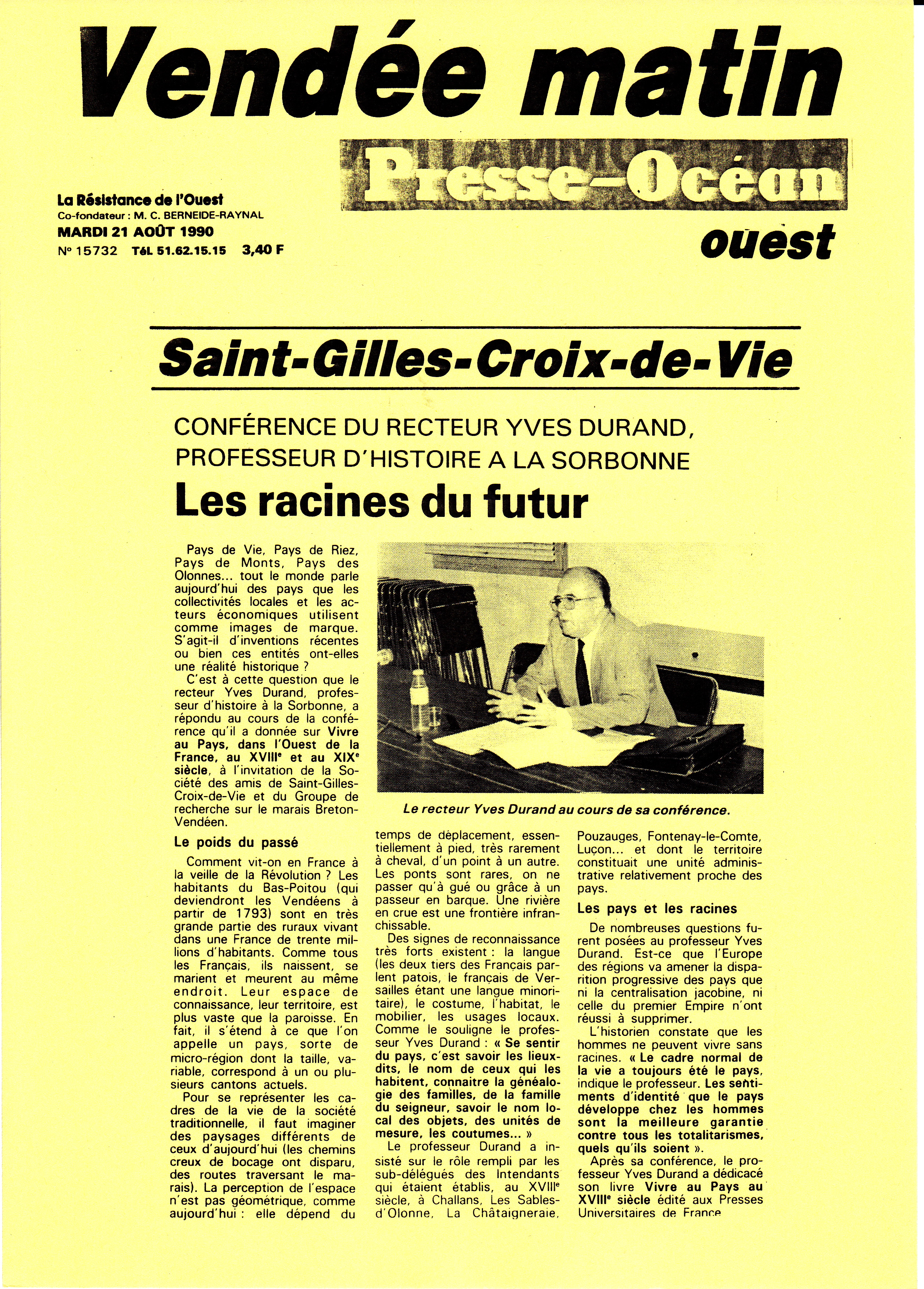 MÉRIGOT Bernard, « Saint-Gilles-Croix-de-Vie. Les Racines du futur. Conférence du recteur Yves Durand, professeur d’histoire à la Sorbonne ? Vivre au Pays au XVIIIe siècle et au XIXe siècle», Vendée matin, 21 août 1990.